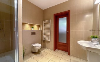 - Eleganckie wykończenie wewnętrzne z użyciem wysokiej jakości materiałów, takich jak panele podłogowe, tynki mineralne i drewniana stolarka drzwiowa.