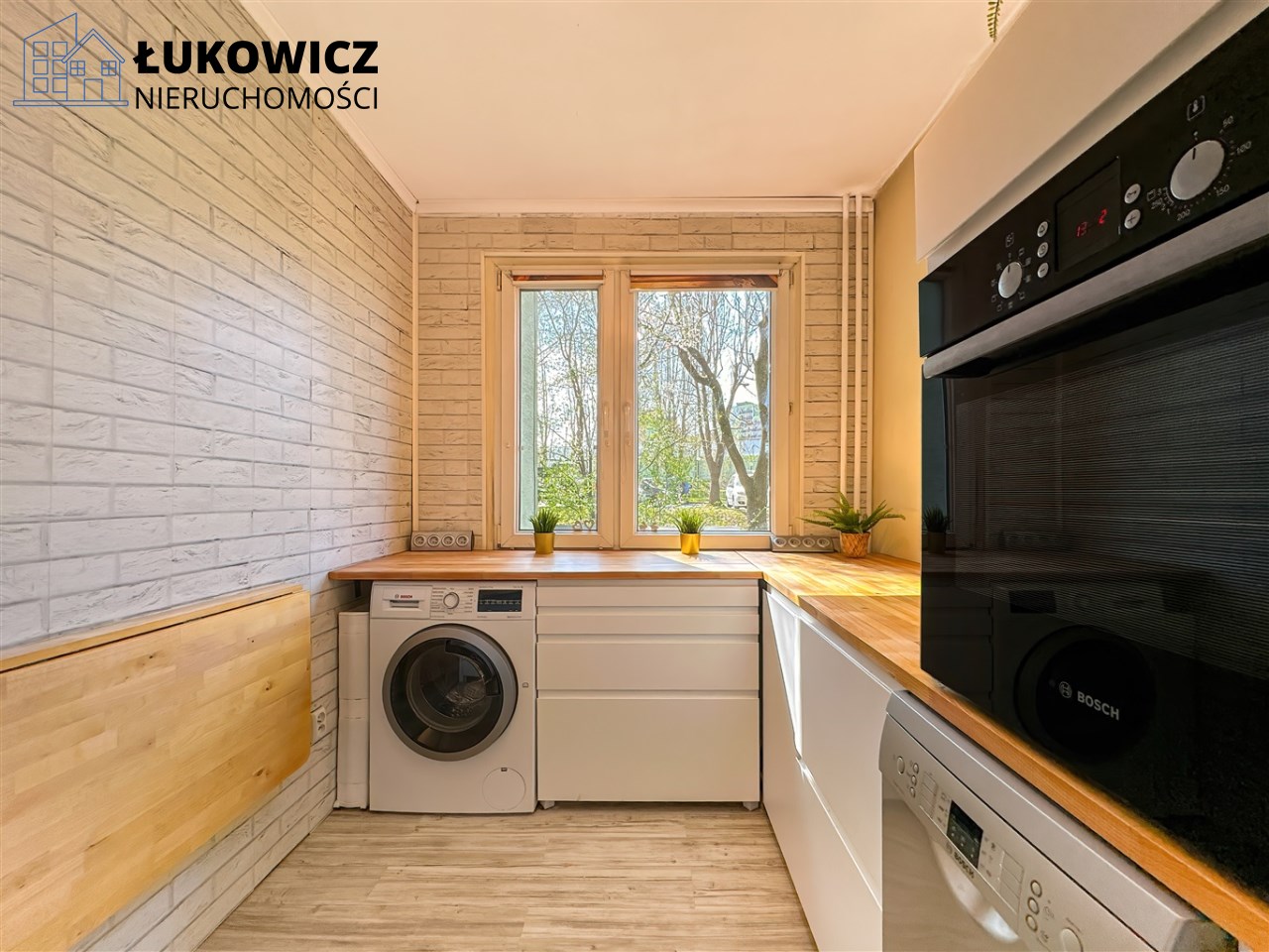 W oddzielnej kuchni znajduje się zabudowa kuchenna z piekarnikiem, zmywarką oraz pralką.