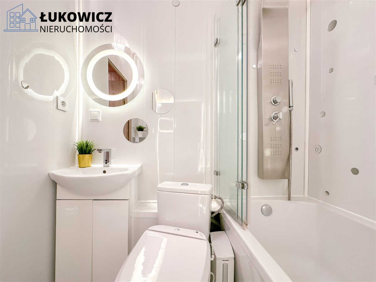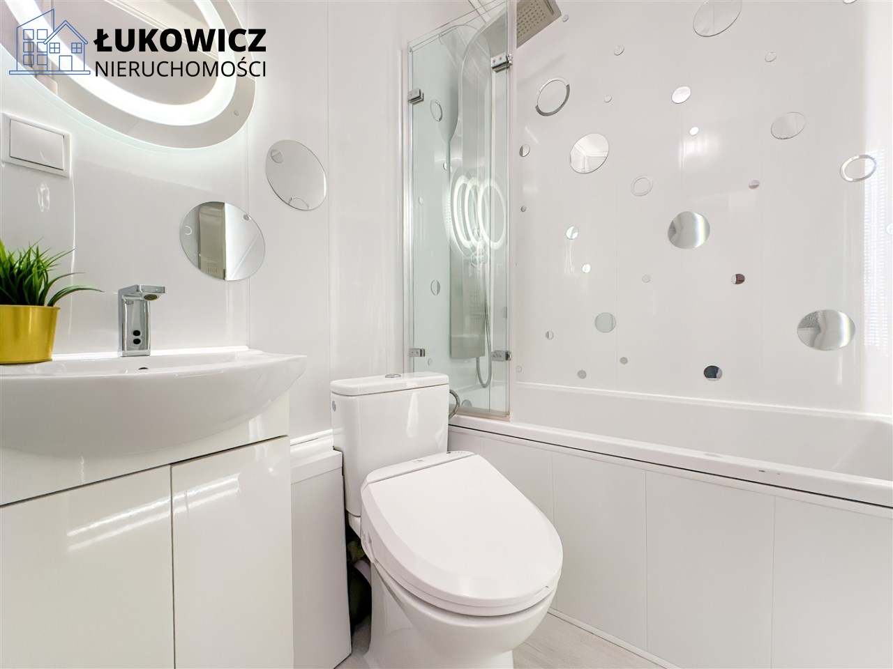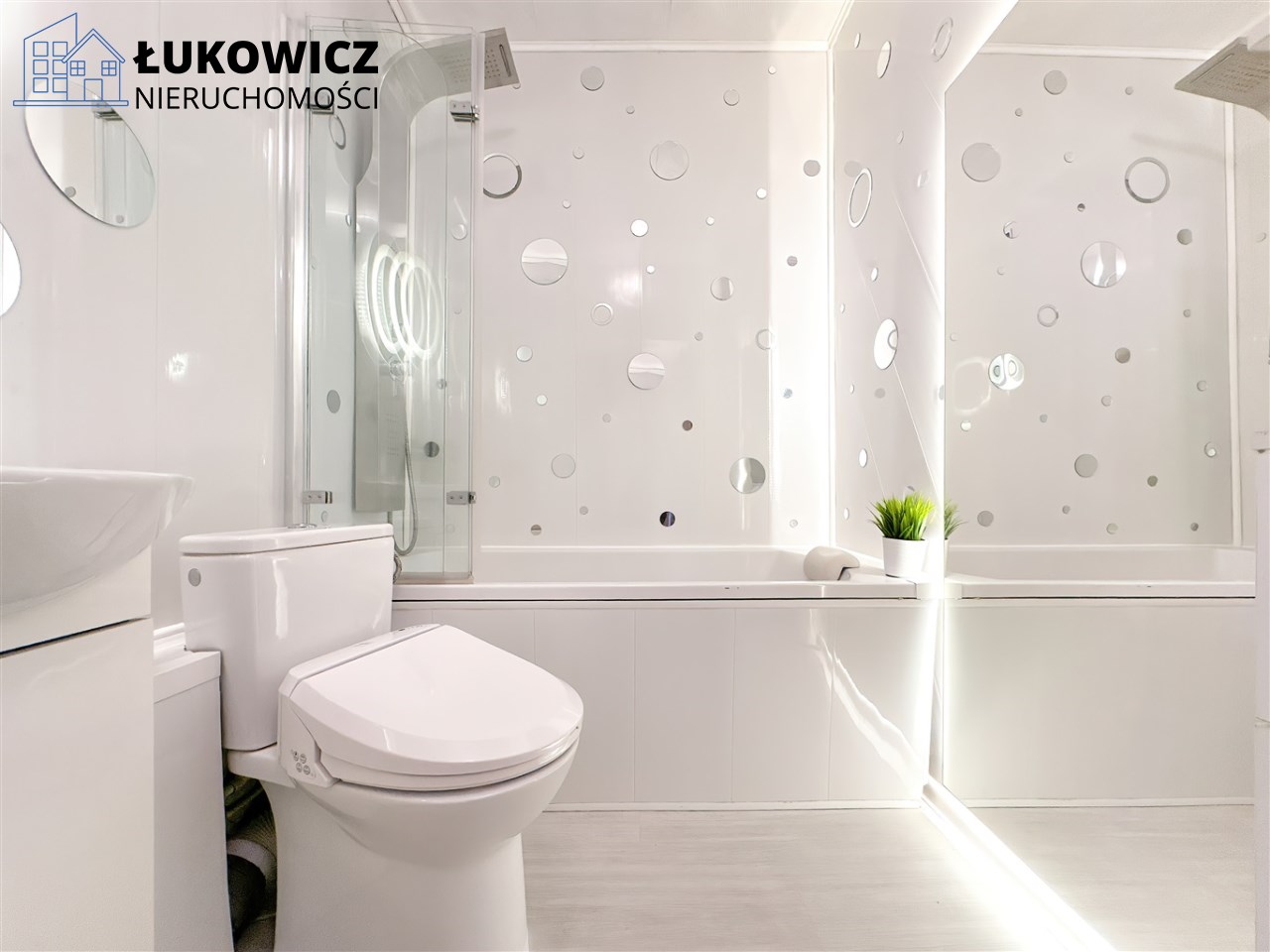 W łazience znajdziemy również dwa, duże podświetlane lustra oraz toaletę z podgrzewaną deską z funkcją bidetu.