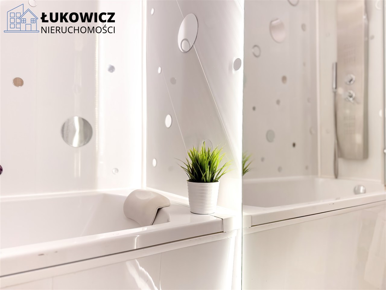Wyposażenie łazienki wanna, umywalka, lustro, kabina prysznicowa