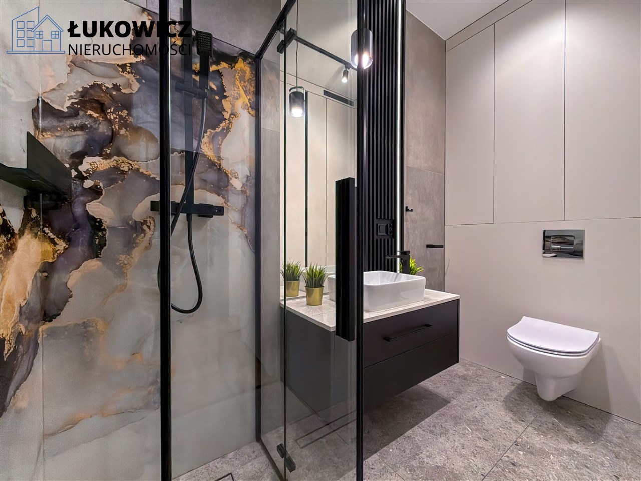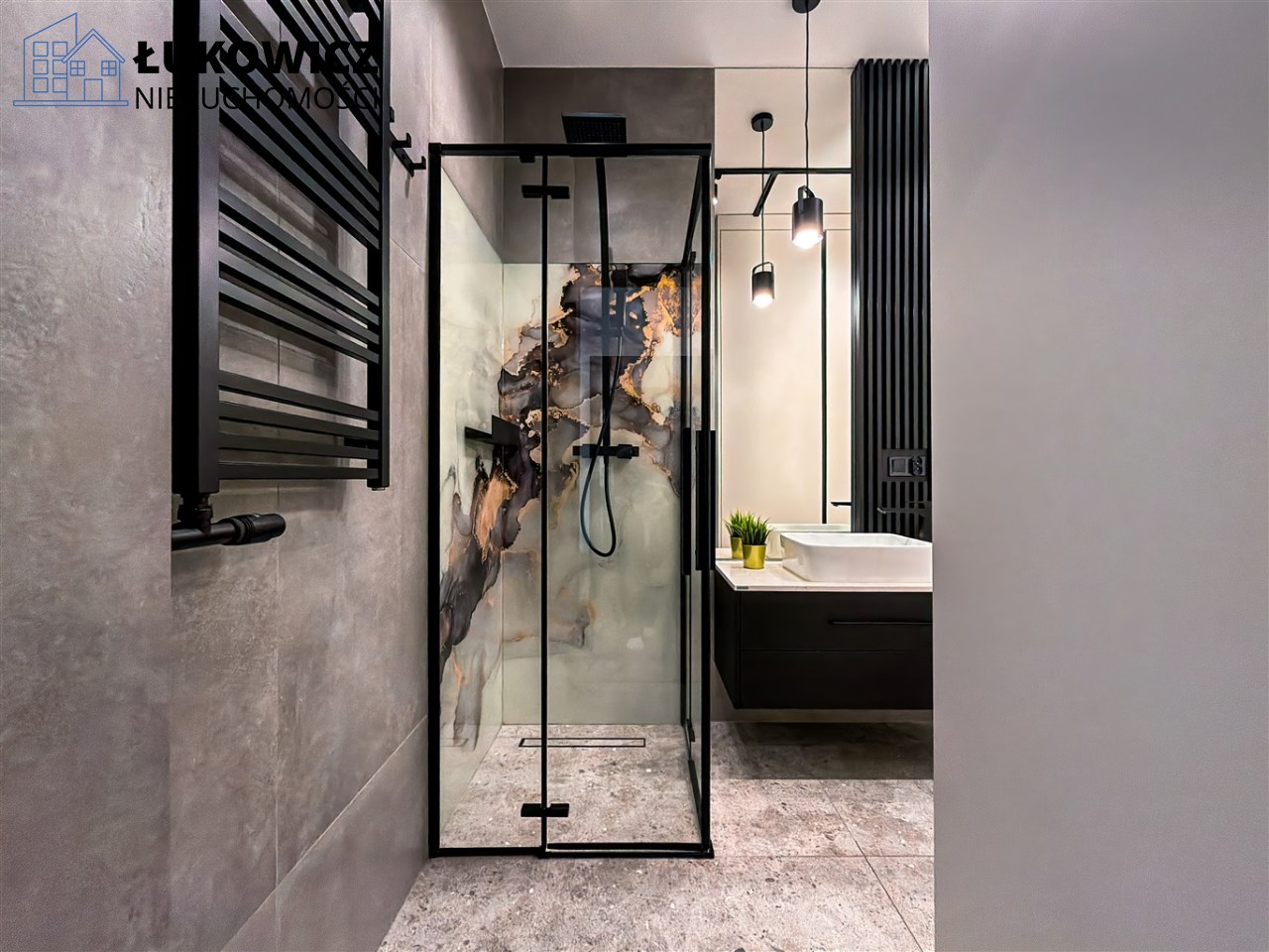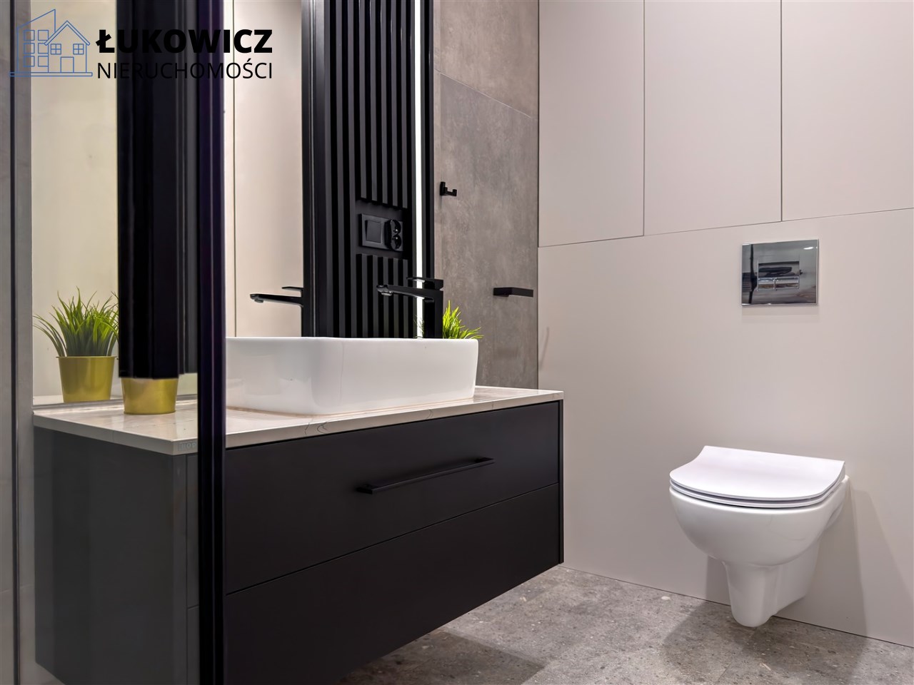 Łazienka została wykończona w nowoczesnym stylu.