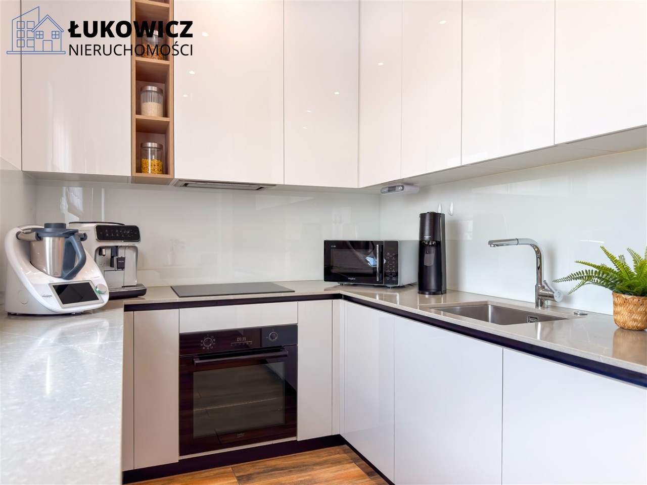 Kuchnia wyposażona jest w nowoczesny sprzęt AGD - lodówka, piekarnik, płyta indukcyjna, zmywarka, okap.