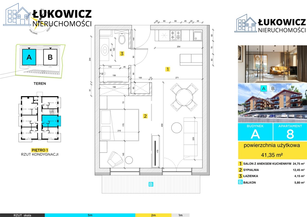 Oferowany lokal ma 41,35 m² i obejmuje:
