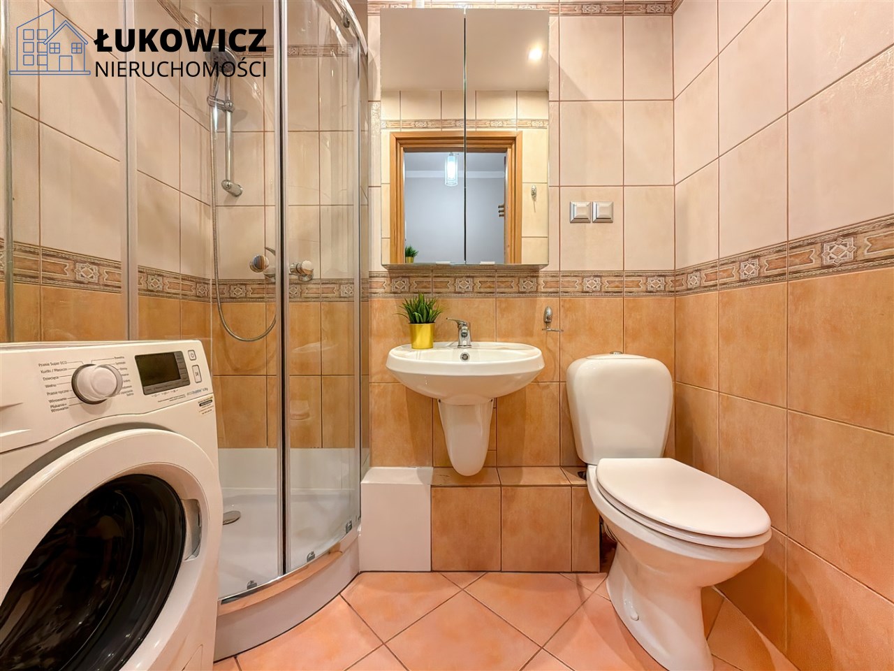 - W łazience znajdziemy pralkę, umywalkę z baterią, szafkę wiszącą z lustrem, kabinę prysznicową, toaletę.