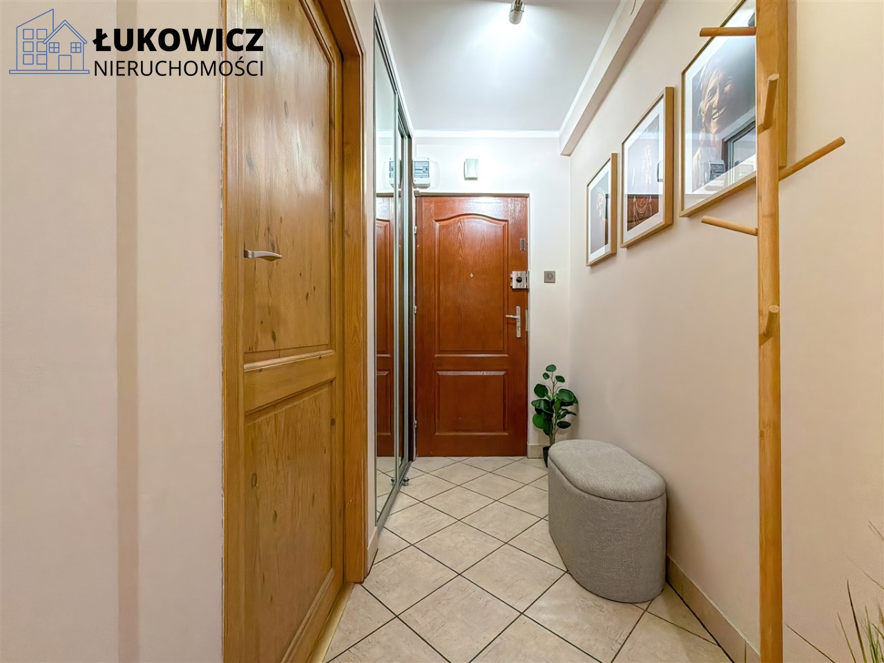 - W przedpokoju znajduje się szafa z drzwiami przesuwnymi, stojak na odzież wierzchnią, regał oraz robot odkurzający.
