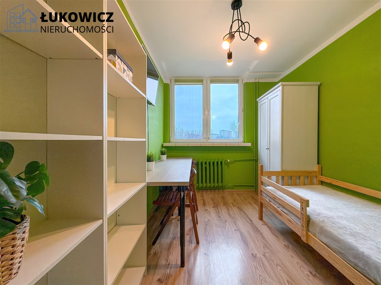 - Pokój z łóżkiem, szafą, regałem, biurkiem z 2 krzesłami.