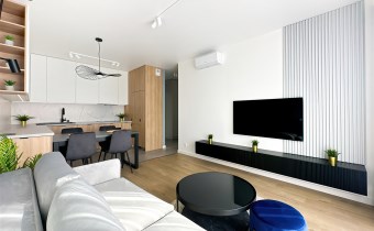 - Nowoczesny salon został wyposażony w kanapę, dywan, stolik kawowy, wiszącą szafkę rtv, telewizor oraz stojącą lampę. Na balkonie oprócz imponującego widoku znajdziemy także komplet wypoczynkowy.