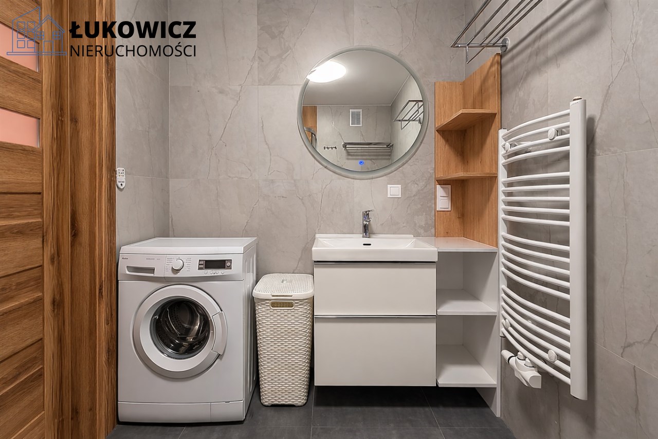 Łazienka wykończona w wysokim standardzie. Znajdziemy w niej pralkę, umywalkę, szuflady do przechowywania, szafkę wiszącą, lustro, kabinę prysznicową oraz toaletę.