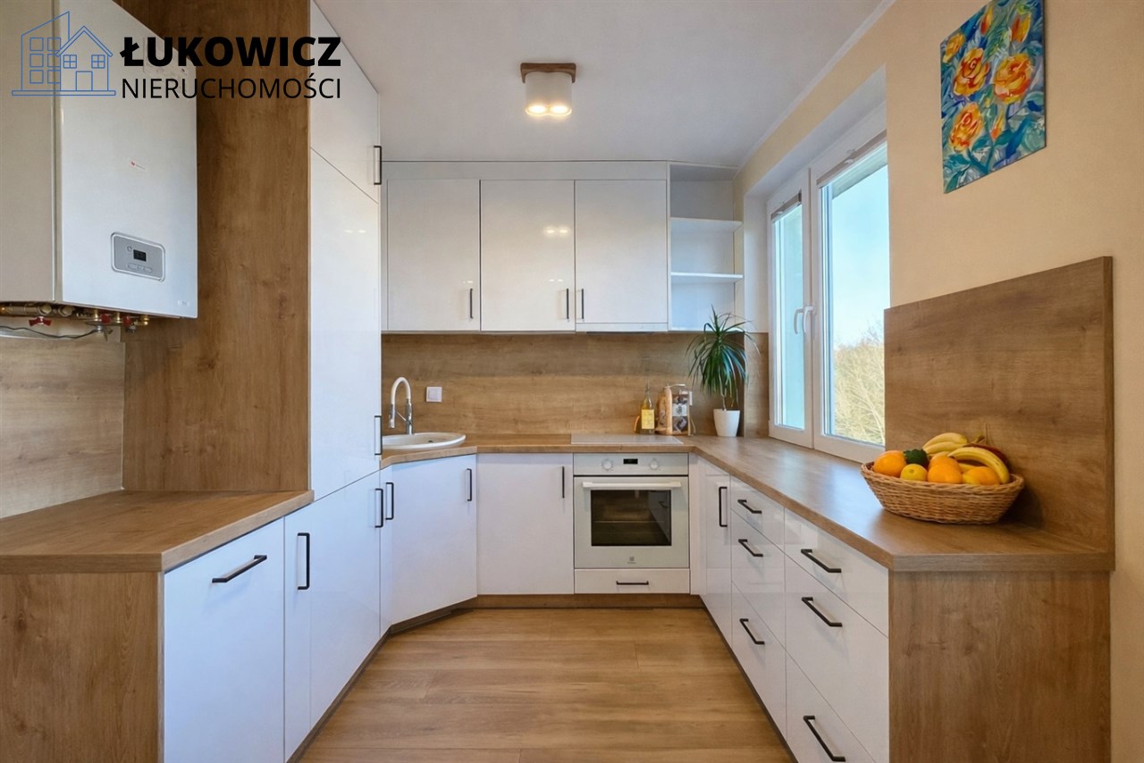 Kuchnia jest w pełni umeblowana i wyposażona w sprzęt AGD - lodówka, piekarnik, płyta indukcyjna, zmywarka, okap. Meble wykonane na wymiar gwarantują dużo miejsca do przechowywania.