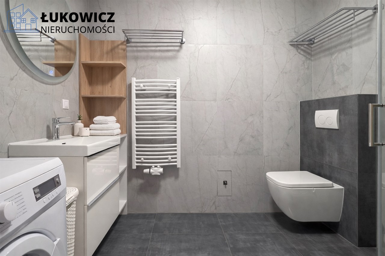 Łazienka wykończona w wysokim standardzie. Znajdziemy w niej pralkę, umywalkę, szuflady do przechowywania, szafkę wiszącą, lustro, kabinę prysznicową oraz toaletę.