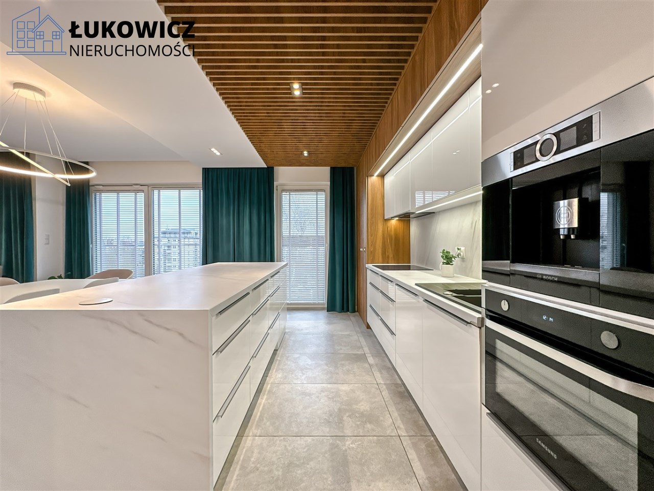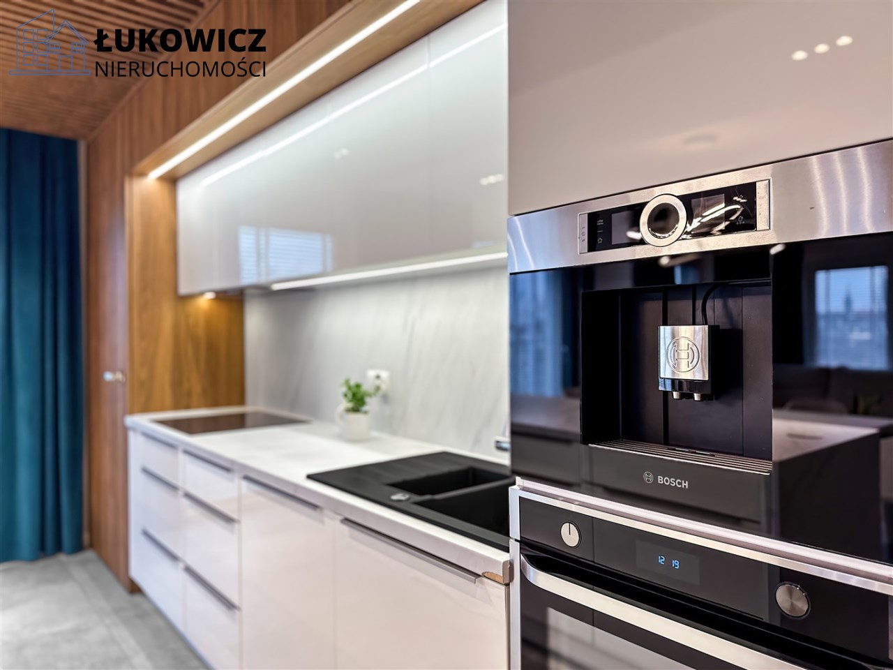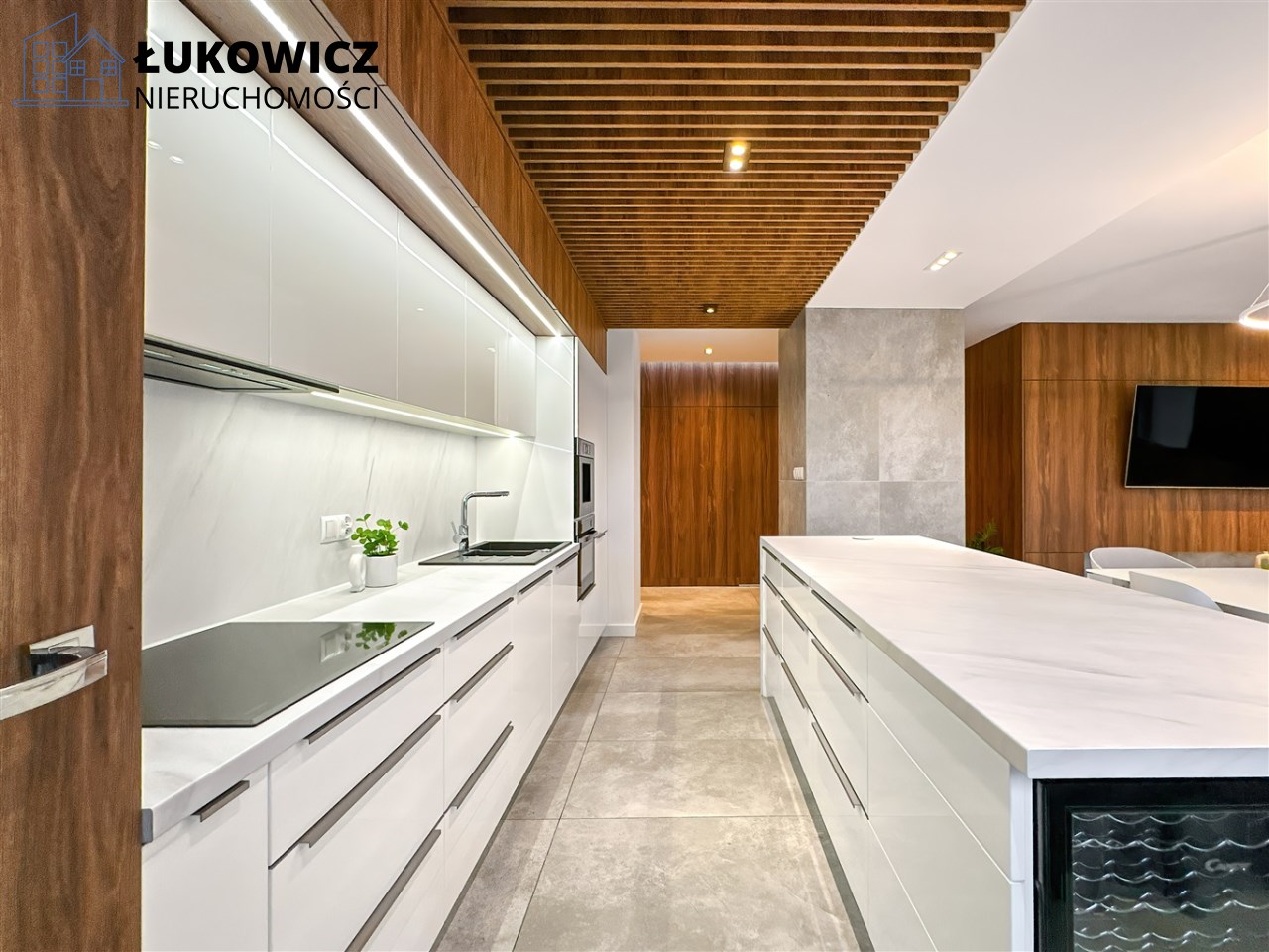 - Część kuchenna została wyposażona w meble na wymiar z zabudowaną zmywarką, płytą indukcyjną, ekspresem do kawy, piekarnikiem, okapem oraz lodówko-zamrażarką. Meble zostały wykonane tak, aby zagwarantować dużo miejsca do pracy oraz do przechowywania z zachowaniem estetycznego wyglądu. Dodatkowym elementem kuchni jest duża wyspa wyposażona w pojemne szuflady z obu stron oraz lodówkę na wino!