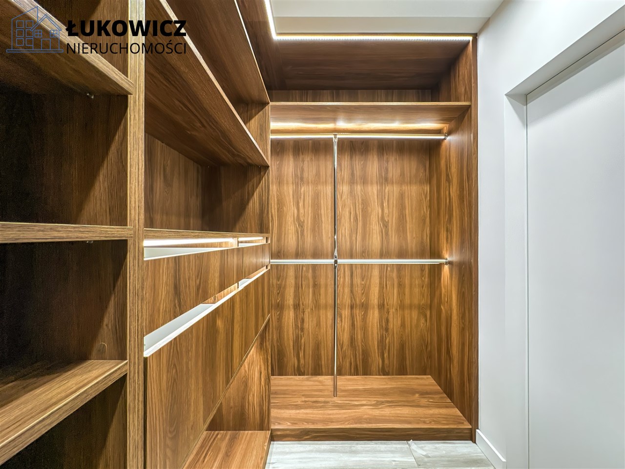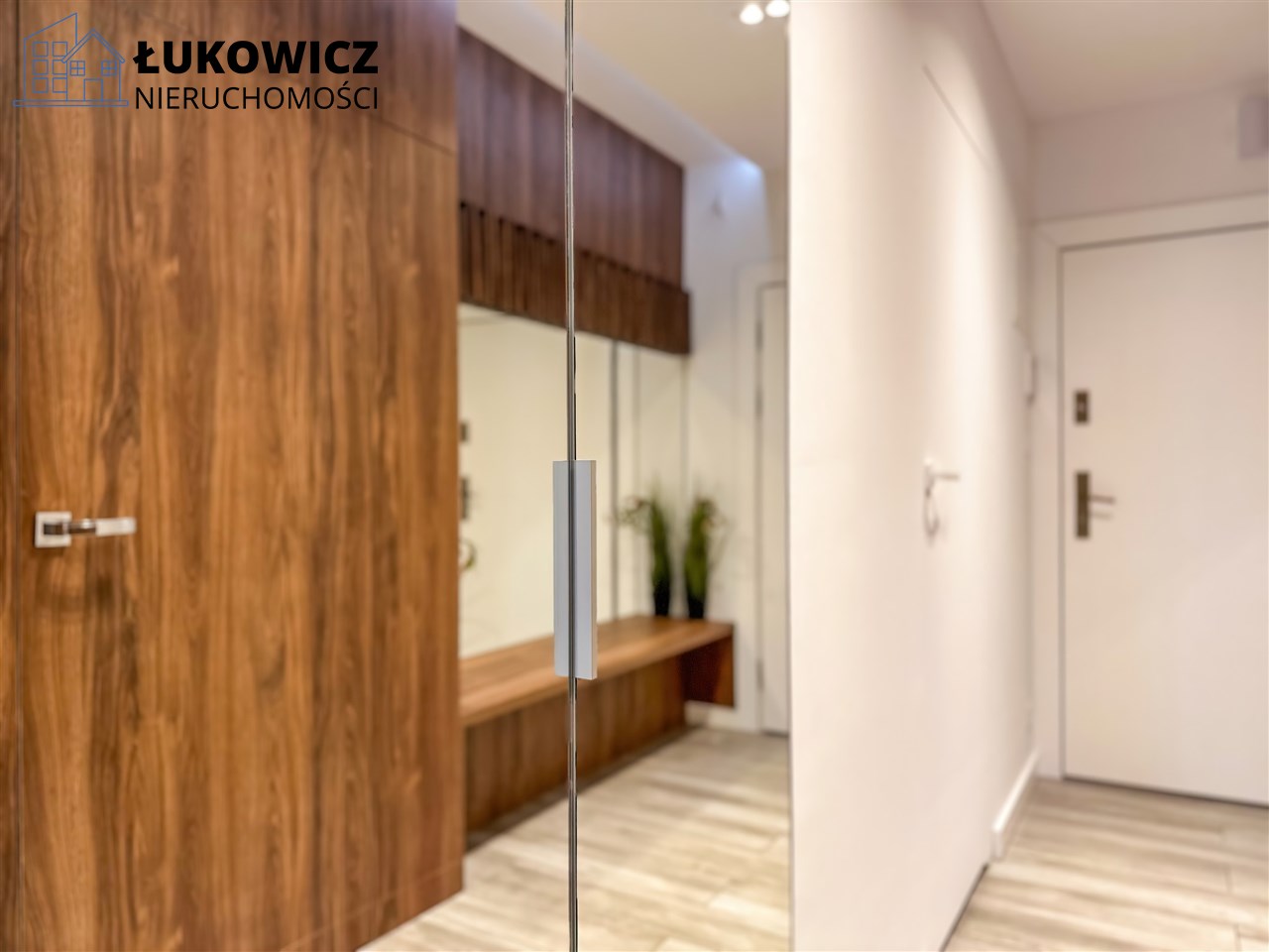 - W przedpokoju znajduje się pojemna, zabudowana szafa z lustrami oraz wewnętrznym oświetleniem. Dostępne jest duże lustro oraz wieszaki na odzież wierzchnią. W przedpokoju są dwa schowki, w tym jeden na pralkę i suszarkę oraz wejście do pojemnej garderoby.