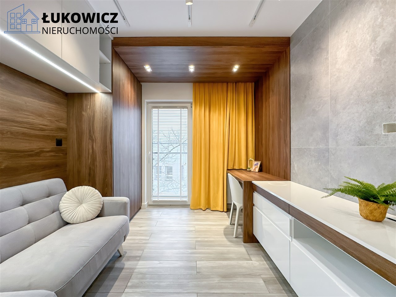 - W pokoju, które może służyć również jako biuro dostępna jest kanapa, półka wisząca, komoda, pojemna szafa oraz biurko.